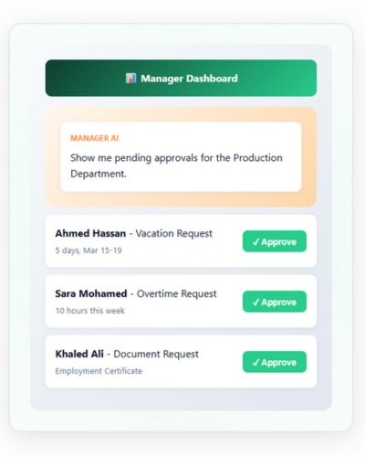 💡 Use CaseA manager asks: "Show me pending approvals for the Production Department."→The assistant displays the list and allows one-click approval.